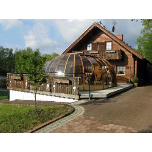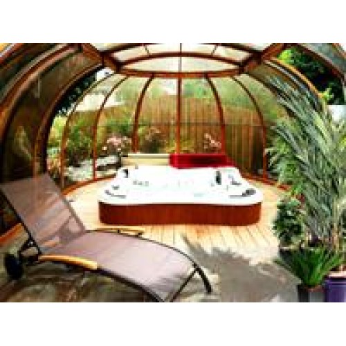 Павильон для спа СПА САНХАУС/СПА ГРАНД САНХАУС- это длинная версия СПА ДОМ ОРЛАНДО. На павильоне размещены две двери и крышка. Модель имеет два полукупола, два сегмента с подвижными дверьми и вентиляцией на крыше. Двойные двери закреплены на полукуполе,которые служат как главный вход в павильон. Дымчатый поликарбонат снижает количество солнечных лучей и делает атмосферу, которая комфортна для ваших глаз. Заодно снижается внутренняя температура.